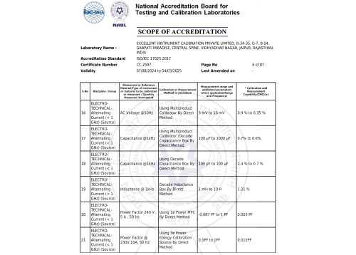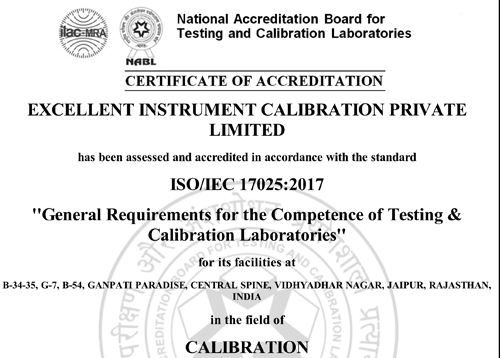 The Laboratory is accredited as Per ISO/IEC: 17025:2017 by NABL, Department of Science and Technology of India for, Mechanical, Electro-technical & Thermal Parameter. High Accuracy Master Equipment's, Highly Educated and Trained personnel and Strict Environmental Conditions are maintained to ensure low Uncertainty of Measurements.